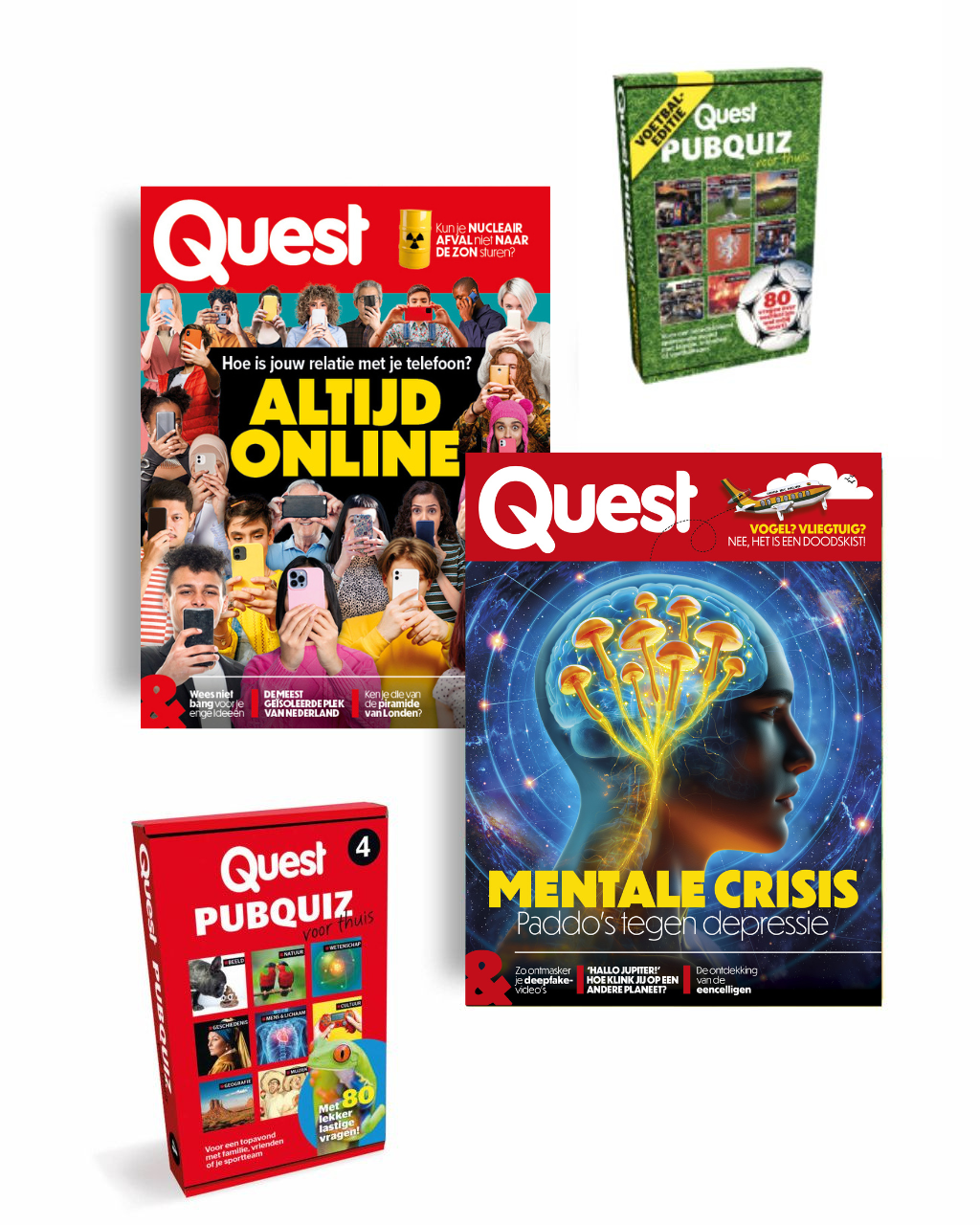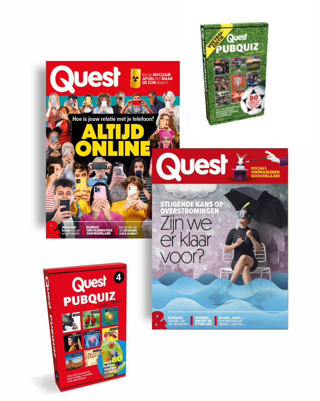 Bent u op zoek naar een feestelijk pakket boordevol tijdschriften, spellen en plezier? Overweeg dan zeker ons pakket met een magazine en een pubquiz. Met de pubquiz (voor thuis) ontdekt u zonder twijfel wie er de meeste feitenkennis in huis heeft. Het belooft een geweldige avond te worden vol entertainment. Combineer de Quest pubquiz bijvoorbeeld met de populaire Quest-tijdschriften voor een ultieme ervaring. Ontdek ons uitgebreide assortiment aan tijdschriften en quizzen, en bestel uw ideale pakket voor de feestdagen of als relatiegeschenk.